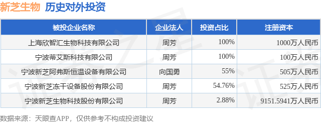 本站消息,根据天眼查APP显示,新芝生物(920685.BJ)新增一起对外投资事件万宝配资,被投资公司为上海欣智汇生物科技有限公司,法定代表人周芳,投资占比为100%。该公司从事专业技术服务业,注册资本为1000万人民币。目前,新芝生物共存在对外投资5项,详见下表: