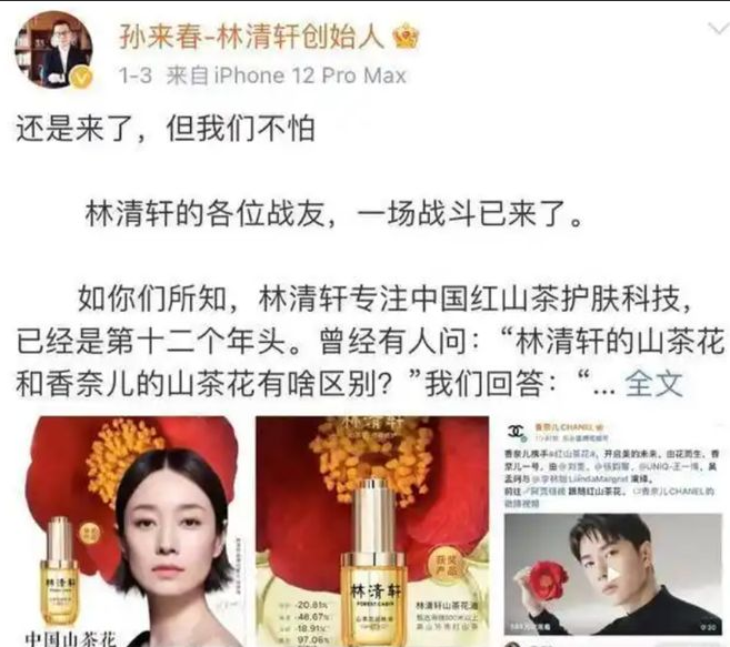 2022年孙来春发文炮轰法国奢侈品牌香奈儿(CHANEL)不正当竞争,挖走公司多位一线员工,同时其推出山茶花护肤系列是“早有预谋”,明显针对林清轩耕耘数十年的红山茶花护肤赛道。而早前的一场直播中,孙来春上演为证明产品成分天然当场喝下品牌精华水的戏码。相关话题多次将林清轩推上热搜榜单。