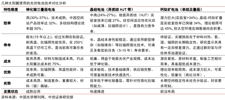 中信建投同样认为,HJT电池在现有量产技术中抗辐射、轻量化优势最明显,2026年后渗透率预计将有所提升,并以执行低轨短期低成本低功率任务为主。钙钛矿及叠层电池有望凭借高比功率、抗辐射优势,在2028年后将逐步承担低轨星座及深空探测任务。