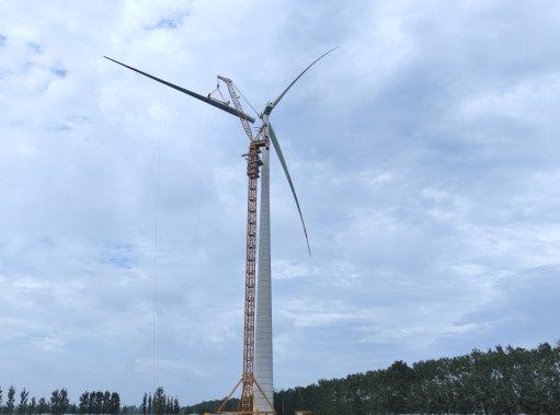 项目安装31台风力发电机组,塔筒采用“混塔+钢塔”形式,风机轮毂安装高度185米,与同类型风机相比也是十足的“大个子”。项目在池塘、树林环绕的有限空间,采用国内先进的风电动臂塔机进行作业,通过模块化节段加高,轻松达到200米以上作业高度,且吊臂变幅范围大,在塔筒全高度段能垂直起吊及精准就位,实现“近塔身小半径+远塔身大半径”的全域作业。