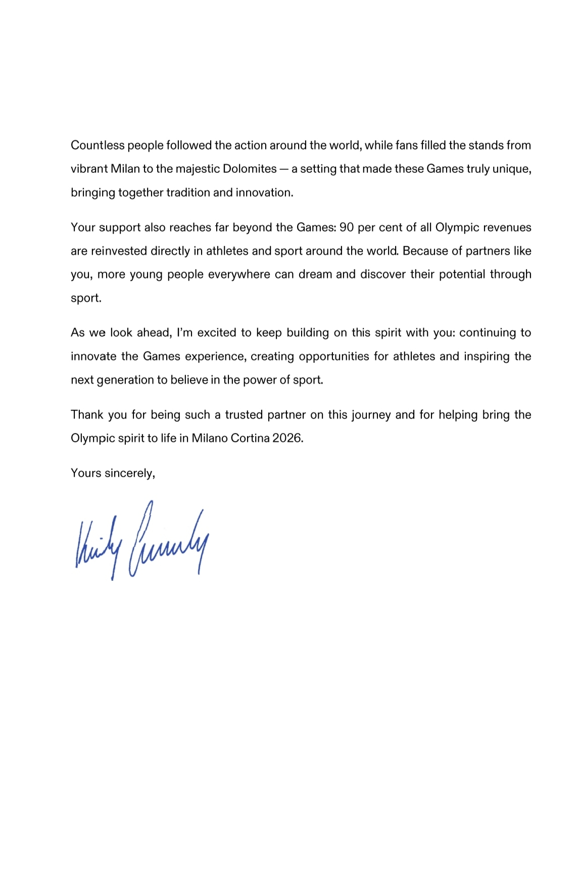 展望未来,我热切期待与您继续深化合作,共同弘扬奥林匹克精神,持续创新奥运体验模式,为运动员创造更多机遇,激励年轻一代坚信体育的无穷力量。