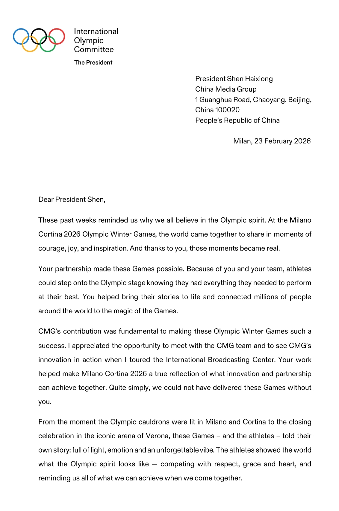 在米兰冬奥会闭幕之际,国际奥委会主席考文垂致函中国中央广播电视总台台长,感谢总台对米兰冬奥会的圆满成功作出的卓越贡献。考文垂在来信中说: