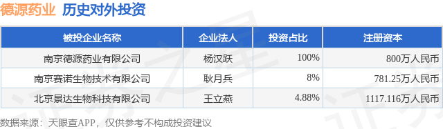 本站消息中股网,根据天眼查APP显示,德源药业(920735.BJ)新增一起对外投资事件中股网,被投资公司为南京德源药业有限公司,法定代表人杨汉跃,投资占比为100%。该公司从事医药制造业,注册资本为800万人民币。目前,德源药业共存在对外投资3项,详见下表: