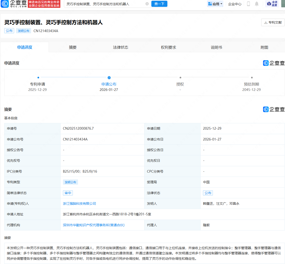 近日,浙江强脑科技有限公司申请公布“灵巧手控制装置、灵巧手控制方法和机器人”专利。专利摘要显示,灵巧手控制装置包括:通信接口,通信接口用于与上位机连接,并接收上位机发送的控制指令;整手管理器,整手管理器与通信接口连接;多个手指控制器,多个手指控制器与整手管理器之间构建有独立的通信信道,并通过通信信道建立连接。本发明通过将多个手指控制器均与整手管理器连接,使得整手管理器可以同步协调管理各手指控制器,实现了在控制灵巧手时,对各手指或各电机进行同步协调控制,提高了灵巧手的动作协调性和稳定性。